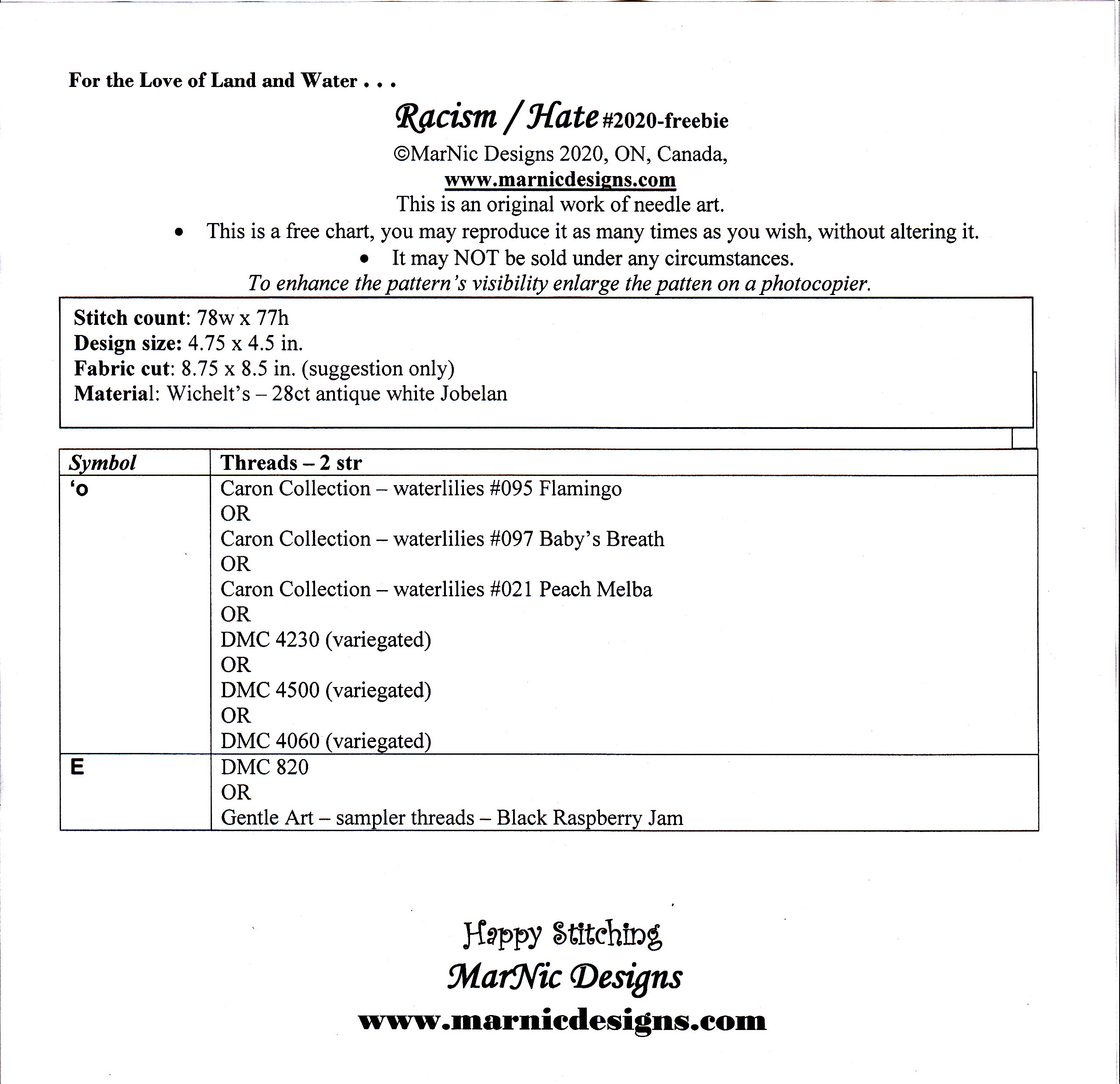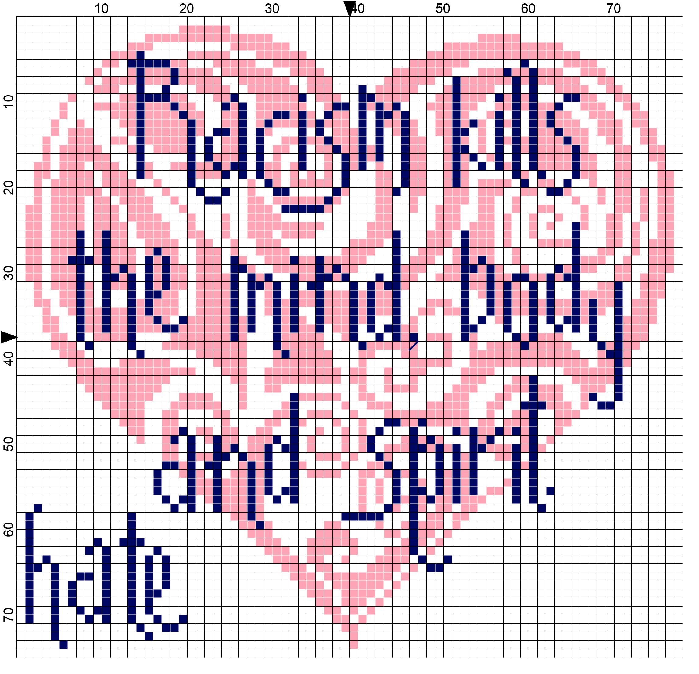 Due to recent events, I designed this, in the middle of the night, when I could not sleep. It is a FREEBIE. You may substitute 'Hate' for 'Racism'. Stitch guide for both is shown. Click on the pictures below for a larger version of each.